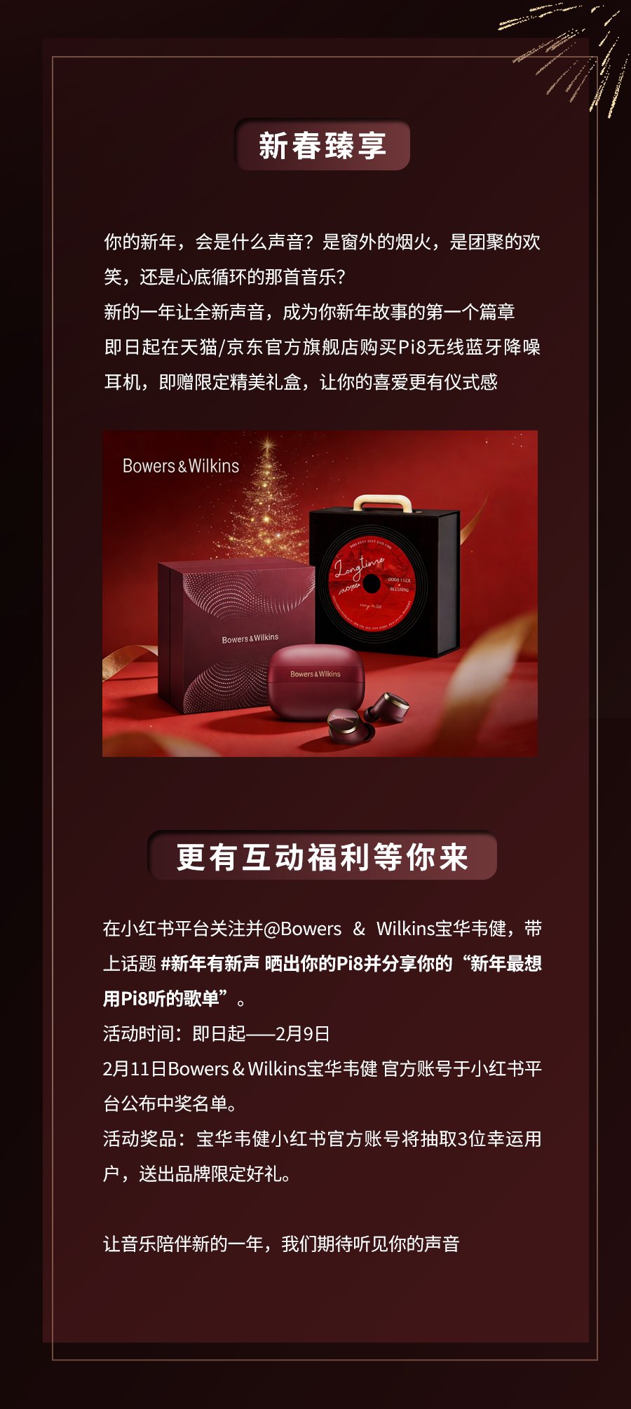 新春不仅是时间的更新,也是一种生活方式的重新审视。围绕这一时刻,宝华韦健同步推出“新春臻享”主题活动,邀请用户回到声音本身,分享属于自己的新年聆听体验。活动期间,用户可在小红书平台关注宝华韦健官方账号,围绕新春聆听场景分享使用Pi8的音乐体验与歌单,以声音记录新年的第一份情绪与记忆。宝华韦健希望通过这样的互动,让音乐在新春的团聚、独处与出行时刻中,成为更具温度的陪伴。在新的一年里,品牌也将持续以真实、纯粹的声音体验,连接技术、艺术与日常生活,为用户带来更具深度与质感的高端生活选择。